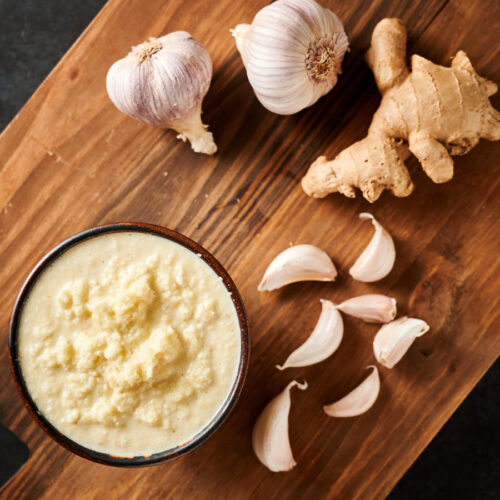 Ginger garlic paste is a crushed mixture of raw ginger and garlic cloves. Optionally, salt is added to the ginger garlic paste while crushing. This compounded mixture is often used in Indian curries and vegetable dishes in many parts of India. It is also used in Thai and Italian cuisine.